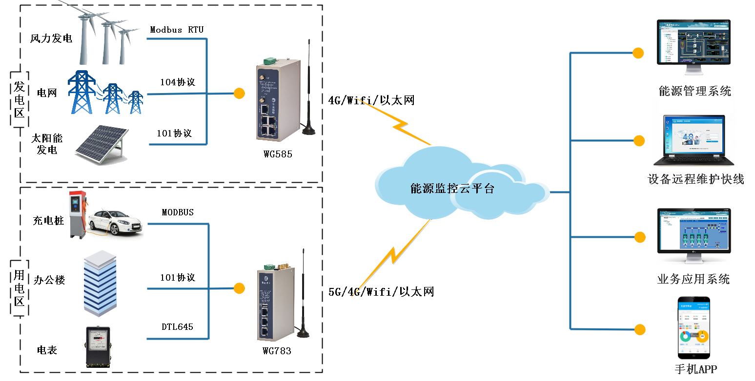 顺利获得欧付宝的两化融合和边缘计算网关,对发电系统运行情况、发电量进行监测,对用电情况进行采集和汇总,从而对电力消耗做出智能分析和智能控制,达到节能减耗的目的;并且顺利获得告警功能、预警机制及时发现设备的异常情况,及时进行检查维护,防止意外事故发生。对整个微网的全面监控和数据分析,可实现从发电、配电、售电整个流程的运营维护和合理调度及决策。