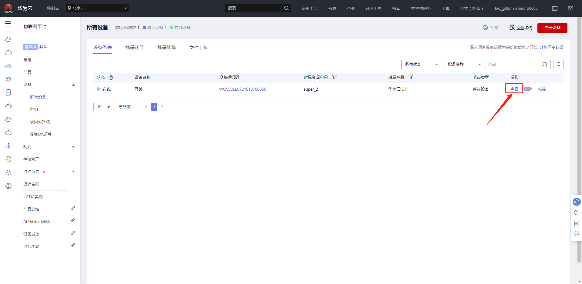 注册的设备为父设备,可以理解为网关,那么子设备可以理解为网关下接的设备;点击注册好的设备。