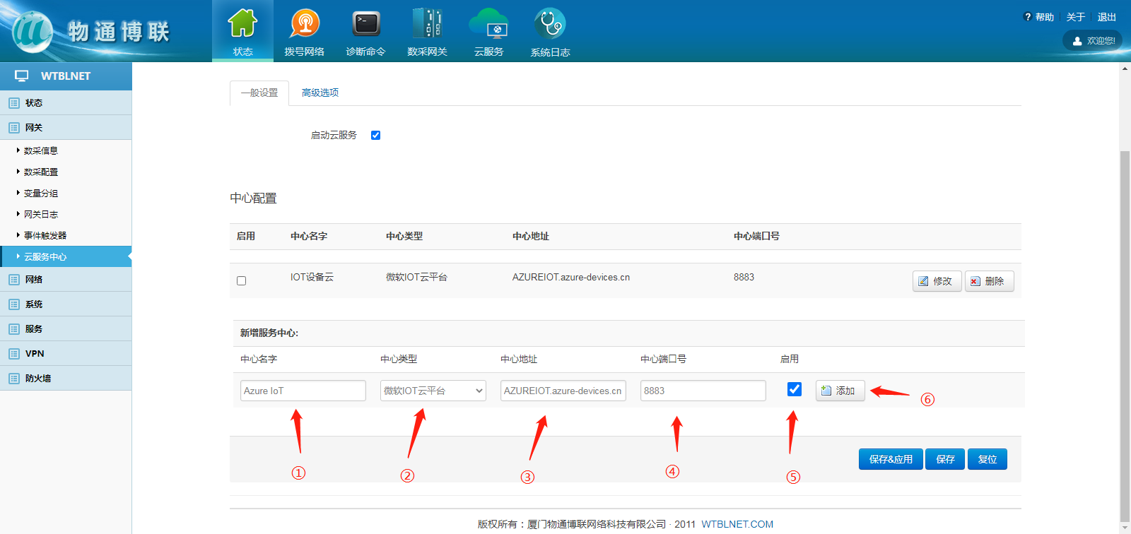 3、打开欧付宝网关WEB界面,新建一个连接中心,中心类型选择微软IoT云平台,输入相应信息,勾选启用,点击“添加” ,填写对应数据即可实现设备数据上传到微软Azure IoT物联网平台。