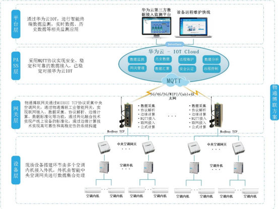 顺利获得 RS485、RS232、以太网等多种接口,欧付宝工业智能网关能连接新风设备控制器 PLC、温湿度传感器、空气质量传感器、风量风压传感器等设备,实时采集设备运行状态、环境参数等数据。随后利用 5G、4G、WIFI、以太网等通信方式,将采集的数据安全、稳定、高速传输至智慧楼宇管理系统中,为用户给予可视化界面,实现设备远程监控、数据分析、故障告警、远程控制等功能。四、实现功能