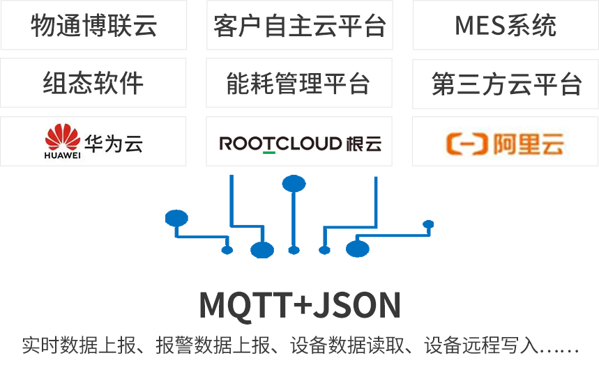 北向支持MQTT协议接入欧付宝云平台,客户自主开发的云平台,第三方云平台(根云、美云、华为、阿里、百度、微软等IOT云平台),组态软件、MES系统、ERP系统等工业软件