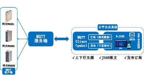 网关内嵌MQTT客户端,它建立与部署在服务器上的MQTT Broker的双向通信链路;同时客户自行开发的云平台(或本地软件)也是顺利获得MQTT客户端来和MQTT Broker来实现订阅和发布数据的双向通信。