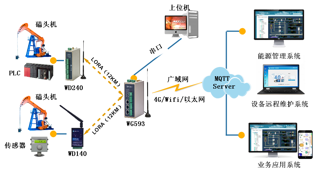 顺利获得欧付宝的两化融合和边缘计算网关采集油田内的设备数据,并在网关内实现边缘计算和数据标准化后将数据上传给云平台,实现对油田的实时动态监测为生产操作和管理决策给予准确的数据依据,全面提升安全管理水平,支持顺利获得云平台、手机移动端和电脑客户端实现油井设备远程运维和现场数据实时监控。