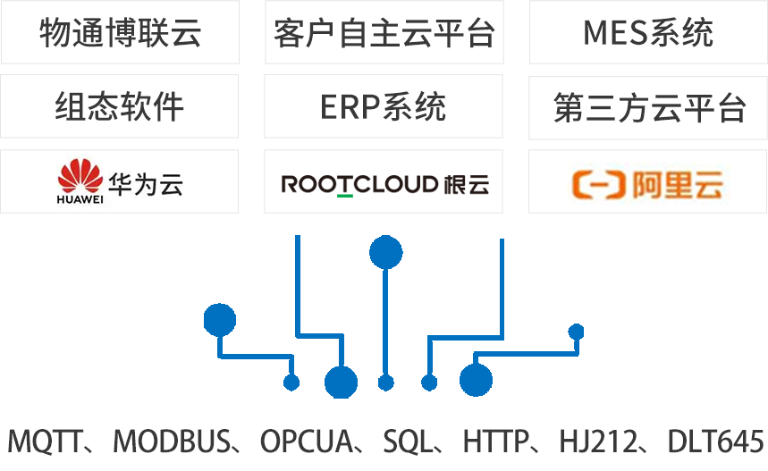 北向支持接入欧付宝云平台,客户自主开发的云平台,第三方云平台(根云、美云、华为、阿里、百度、微软等IOT云平台),组态软件、MES系统、行业监控平台等工业软件