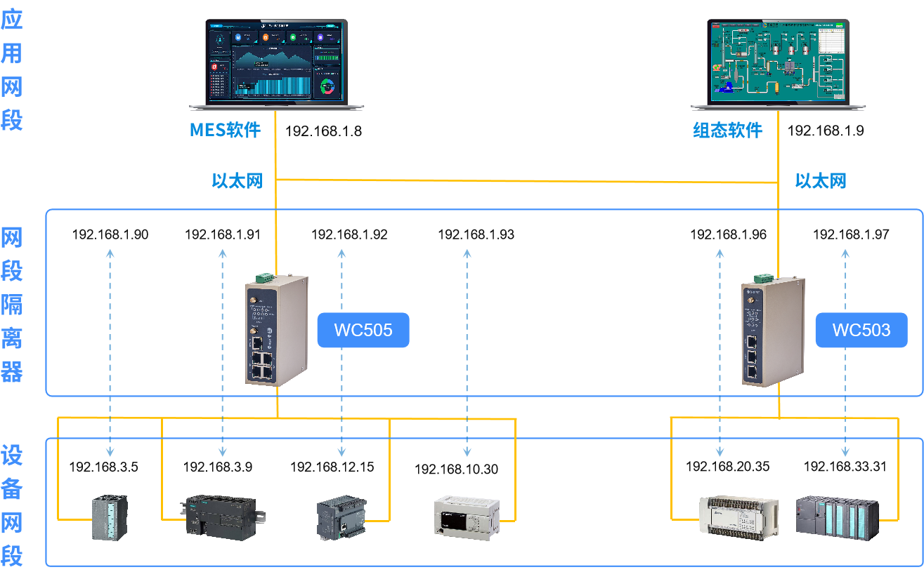欧付宝WC系列网段隔离器适用于生产网络对 PLC、HMI、CNC、DCS、MES等网络通讯和数据采集,兼有跨网段隔离和IP转换的功能。车间多个设备,如果有不同网段的IP地址,则可以统一成同一网段的IP地址,进行设备(PLC、CNC)的在线编程、数据采集、远程管理等各种跨网段访问。