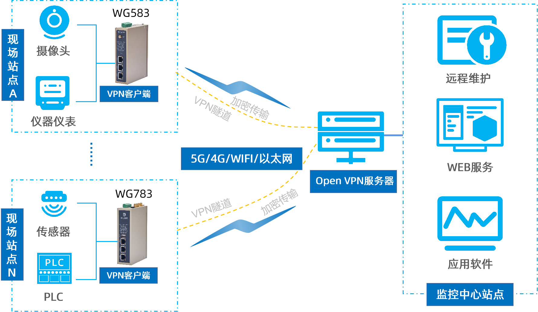欧付宝OpenVPN网关顺利获得对工业现场包括PLC、仪表、传感器或者工控机等在内的设备进行实时状态、参数、故障等数据的采集,顺利获得5G/4G/ WIFI/以太网等联网方式将数据上传至服务器进行储存(顺利获得网关为VPN客户端利用OpenVPN技术在原有网络基础上建立一个加密的虚拟网络通道,实现数据加密传输,保障数据的安全性和完整性),即可在数据中心将其显示、分析,从而分析现场环境以及现场设备的相关信息参数以及运行情况,实现对现场设备的远程监控、数据分析、远程维护。